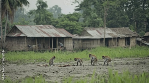 Naklejka premium Monkeys Exploring a Rural Landscape with Traditional Huts Nearby