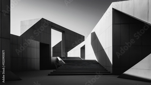 Fototapeta premium Monochromatic architectural design with geometric shapes, open spaces, and...
