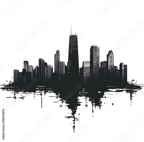 © chonchol, Naklejka premium Monochromatic city skyline illustration. Urban, modern, and minimalist design.
