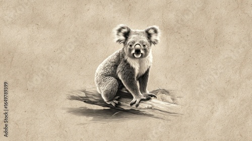 Obraz premium Monochromatic koala perched on a branch, against a rustic paper-textured...