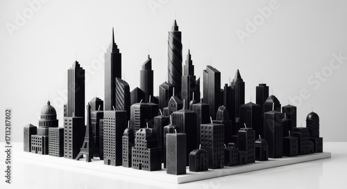 Naklejka premium Monochromatic metropolitan dreamscape: Black architectural silhouette on a...