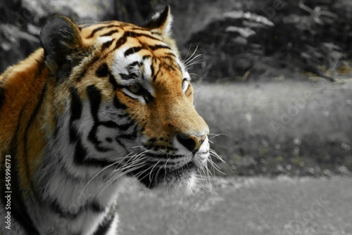 Naklejka premium Monochromatic shot of a fierce-looking tiger in the wild