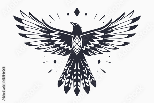 © Shipon, Obraz premium Monochromatic stylized eagle spreads out its detailed wings, adorned with diamonds and feathers