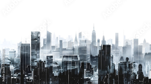 Fototapeta premium Monochromatic Urban Skyline Stencil: Architectural Structures and Patterns in Cityscape Silhouettes