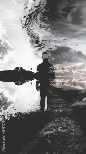Fototapeta premium Monochrome Abstract Silhouette in Distorted Landscape Representing Depression