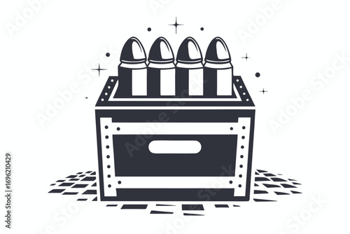 © SWORNALY, Naklejka premium Monochrome Ammunition Box on White Background with Stars and Projectile