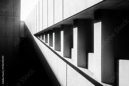 © ali, Obraz premium Monochrome architectural corridor with repeating vertical concrete columns casting strong shadows and light contrast creating geometric patterns