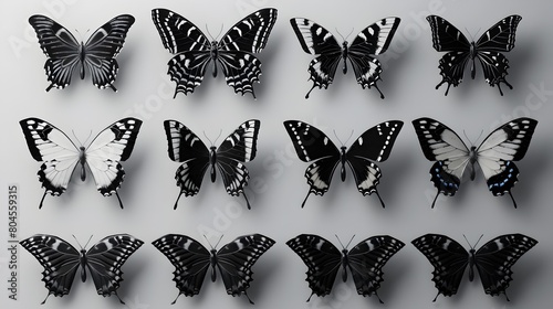 © JIRAPHASS, Fototapeta premium Monochrome Brushstroke Sketch of Butterfly and Insect Specimens on White Background