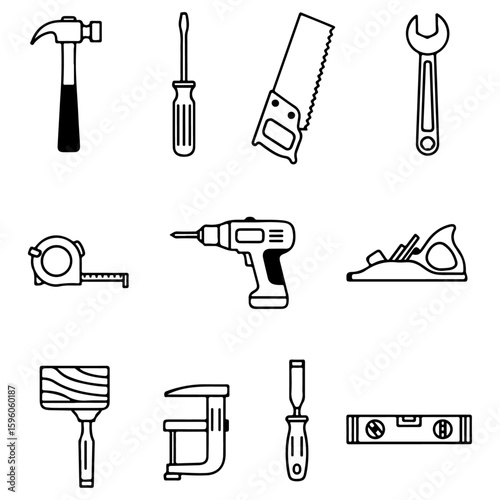 © Joynal, Fototapeta premium Monochrome Carpentry Tools Vector Line Icon Set