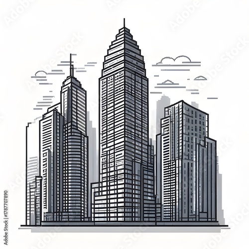 Naklejka premium Monochrome cityscape illustration with skyscrapers and clouds.