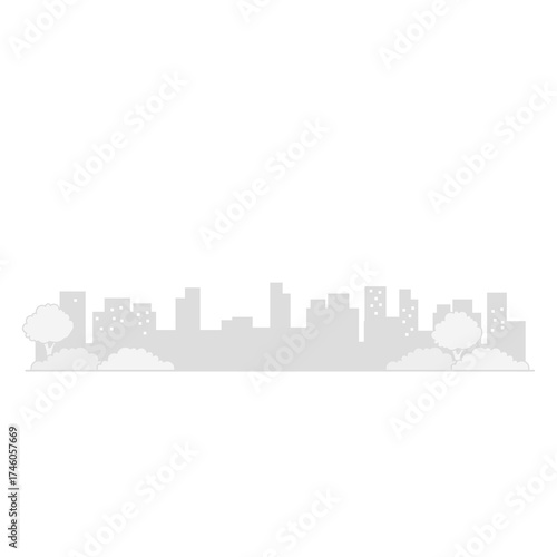 © ppsj, Naklejka premium Monochrome Cityscape Silhouette on Transparent Background Urban Skyline with Buildings Trees Bushes Simple Illustration Minimalist Design Architectural Landscape