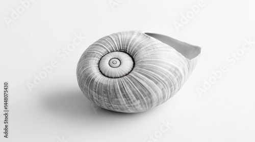 © Danang, Obraz premium Monochrome close-up of a single spiral seashell on white background.