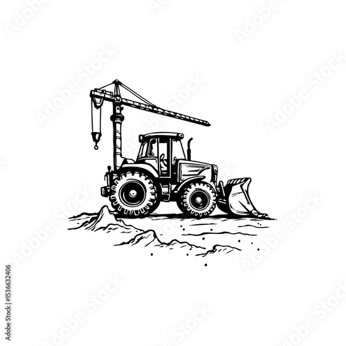 © LgsDesign, Fototapeta premium Monochrome depiction of a heavy-duty construction vehicle on a rough terrain landscape