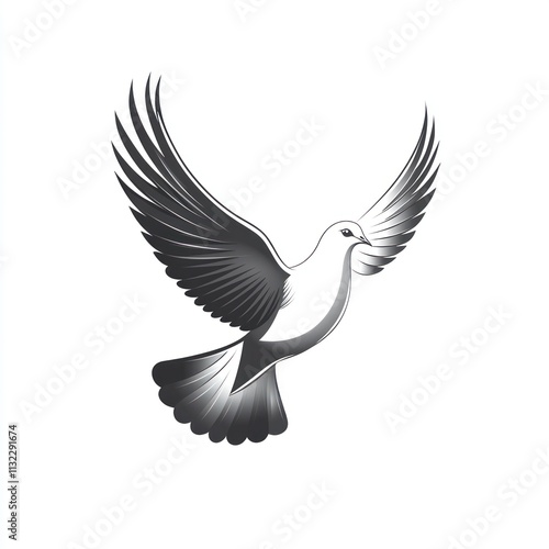 © lestari, Fototapeta premium Monochrome dove in flight, wings spread wide, isolated on white background.