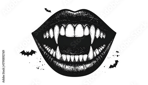 © Mera, Naklejka premium Monochrome drawing of a vampire's open mouth with sharp teeth and bats flying around it
