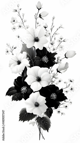 Naklejka premium Monochrome floral arrangement featuring various blossoms and buds in shades of grey, black, and white, with detailed leaves and stems