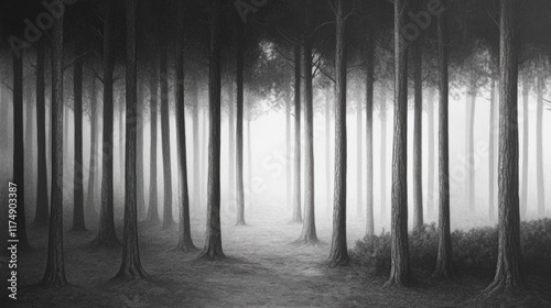 Naklejka premium Monochrome forest path disappearing into foggy light.
