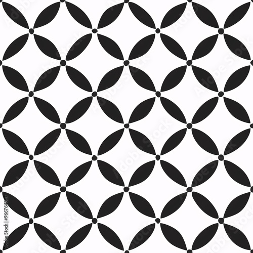 © Pojjanee, Fototapeta premium Monochrome Geometric Harmony: A seamless pattern of interlocking black circles and diamonds creates a bold, modern aesthetic.