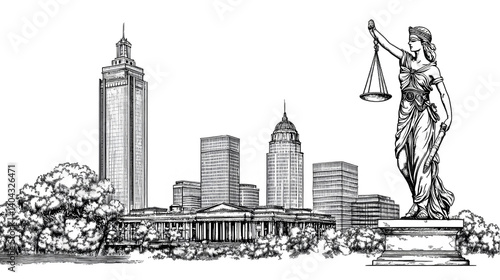 Obraz premium Monochrome Illustration of a City Skyline with Lady Justice and Buildings