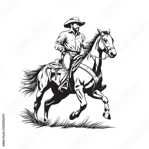 Fototapeta premium Monochrome illustration of a cowboy riding a galloping horse, detailed with...