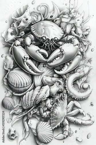 © Bebek, Obraz premium Monochrome illustration of a crab amidst various seashells and marine creatures.
