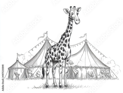 © Npicture, Obraz premium Monochrome illustration of a giraffe in front of circus tents.