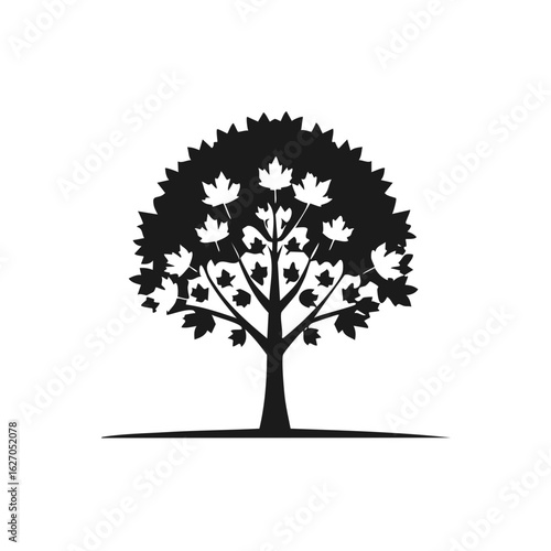 © FryArt, Obraz premium Monochrome Illustration of a Maple Tree Silhouette with Leaves and Branches