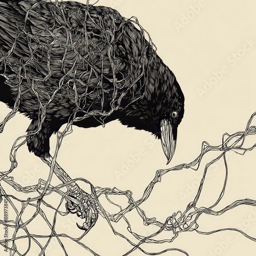 Fototapeta premium Monochrome illustration of a raven perched on winding branches, pecking downwards