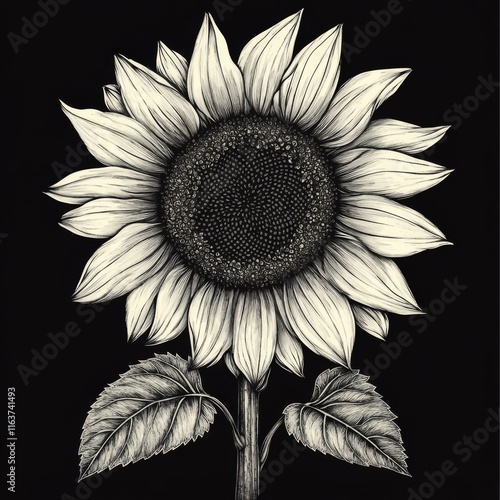 Fototapeta premium Monochrome illustration of a sunflower with detailed petals, stem, and leaves against a black background.