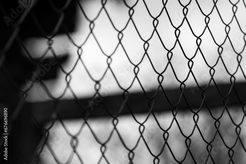 © Alpar, Fototapeta premium Monochrome image, close up wired garden fence silhouette shot on a cloudy day.