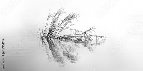 © Nijat, Obraz premium Monochrome image of dehydrated wild grass submerged in calm water with delicate reflections, featuring soft shades of gray and white tones.