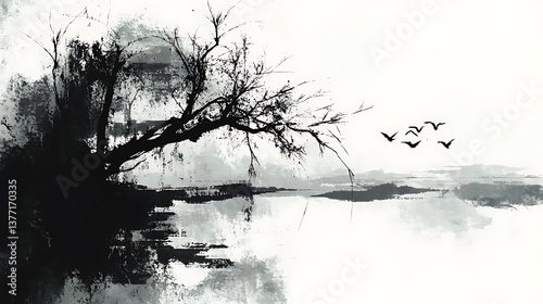© MASJAB, Fototapeta premium Monochrome lake with tree, and birds.