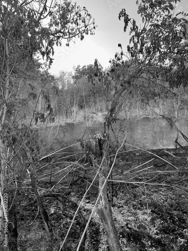 Obraz premium Monochrome landscape of burnt grassland and forest edge, showing traces of...