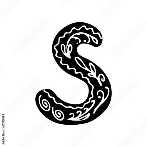 Fototapeta premium Monochrome letter S isolated on white background with floral pattern, vector hand drawn illustration for logo, postcard design, posters, banners, etc