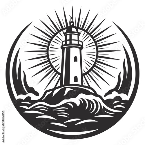 Naklejka premium Monochrome lighthouse on rocky outcrop in stormy sea with light beams, suitable for marine navigation, guidance, and resilience themed vector projects