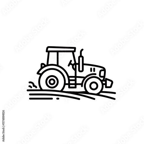 Fototapeta premium Monochrome line art illustration shows a working farm tractor silhouette moving over field lines, concept for agriculture company logos, farming equipment dealer advertisements, and sustainable
