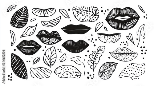 Naklejka premium Monochrome lips and leaves design; botanical beauty; graphic art; website, print