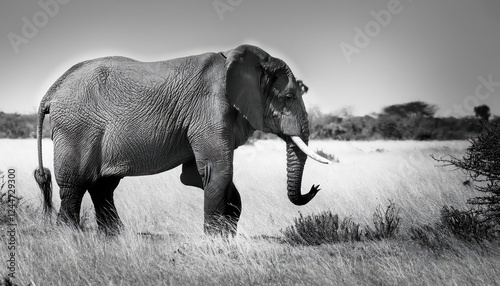 © netsay, Naklejka premium Monochrome Majesty A Powerful Black and White Elephant Stands in Grassy Savannah Plains under Dramatic Skies at Dusk