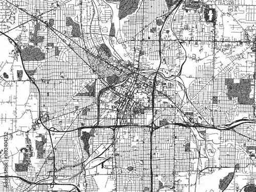 Naklejka premium Monochrome map illustration of Akron, Ohio, with hand-drawn style textures...