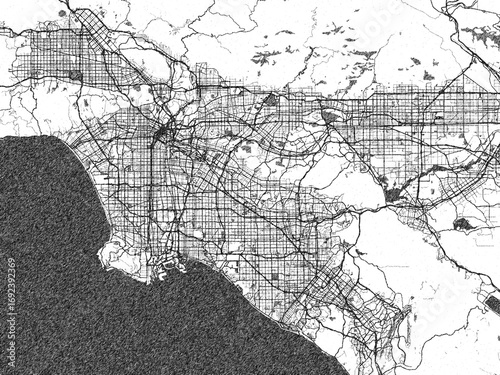 Fototapeta premium Monochrome map illustration of Los Angeles, California, with hand-drawn style textures highlighting its streets and rivers.