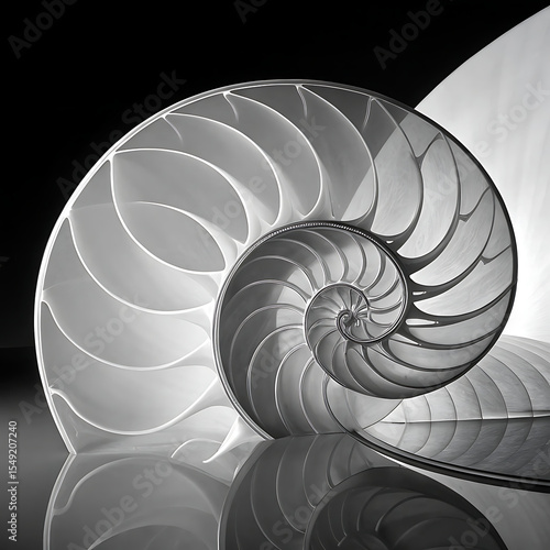© Arafat, Obraz premium Monochrome Nautilus Shell Section with Reflection on a Dark Background
