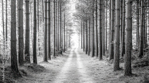 Naklejka premium Monochrome Path Through Tall Pine Trees In A Forest