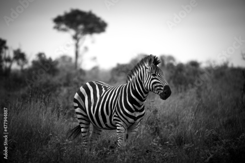 Fototapeta premium Monochrome portrait of stripped zebra in africa