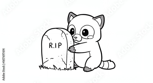 © Faustina, Fototapeta premium Monochrome Raccoon Hugging a Tombstone with RIP Inscription in a Line Art Style on a White Background
