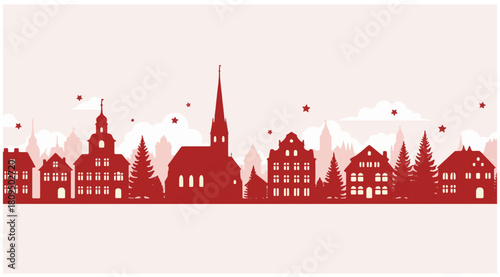 Fototapeta premium Monochrome Red Christmas Town Skyline Silhouette