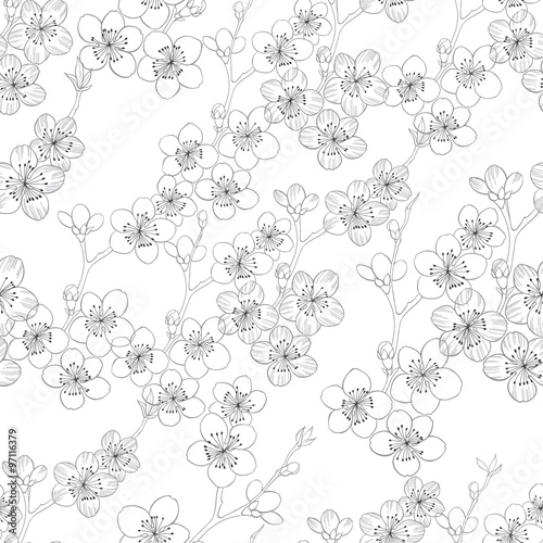 © maritime_m, Fototapeta premium Monochrome seamless pattern with blooming cherry branches.