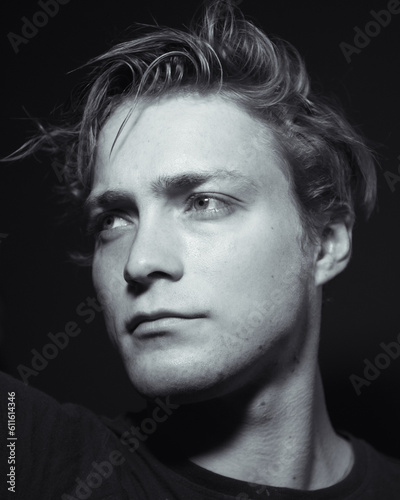 © harry, Fototapeta premium Monochrome shot of a male model in a dark room