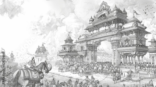 © Viktoriia, Obraz premium Monochrome sketch of a bustling Indian temple scene with horse carriages and crowds