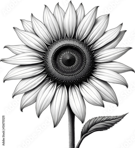 © thienhuong, Fototapeta premium Monochrome Sunflower Illustration, Detailed Center, Transparent Background