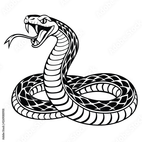 Fototapeta premium Monochrome vector art of coiled cobra, hood expanded, fangs visible, perfect for tattoos or logos.